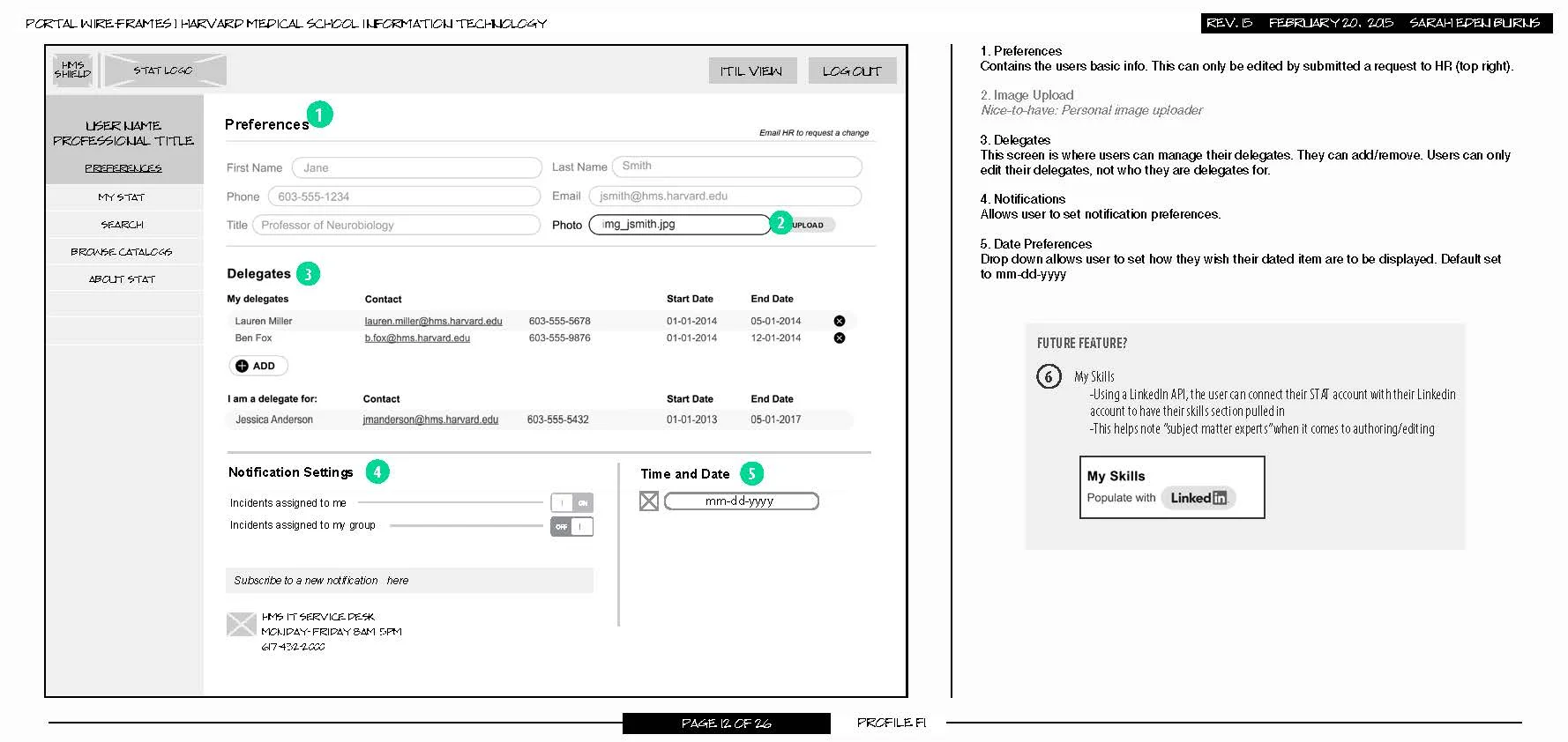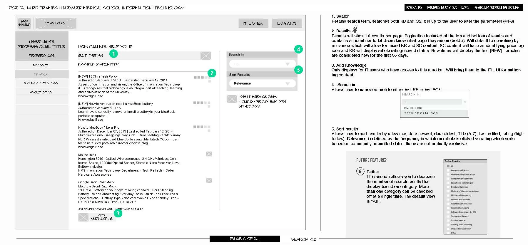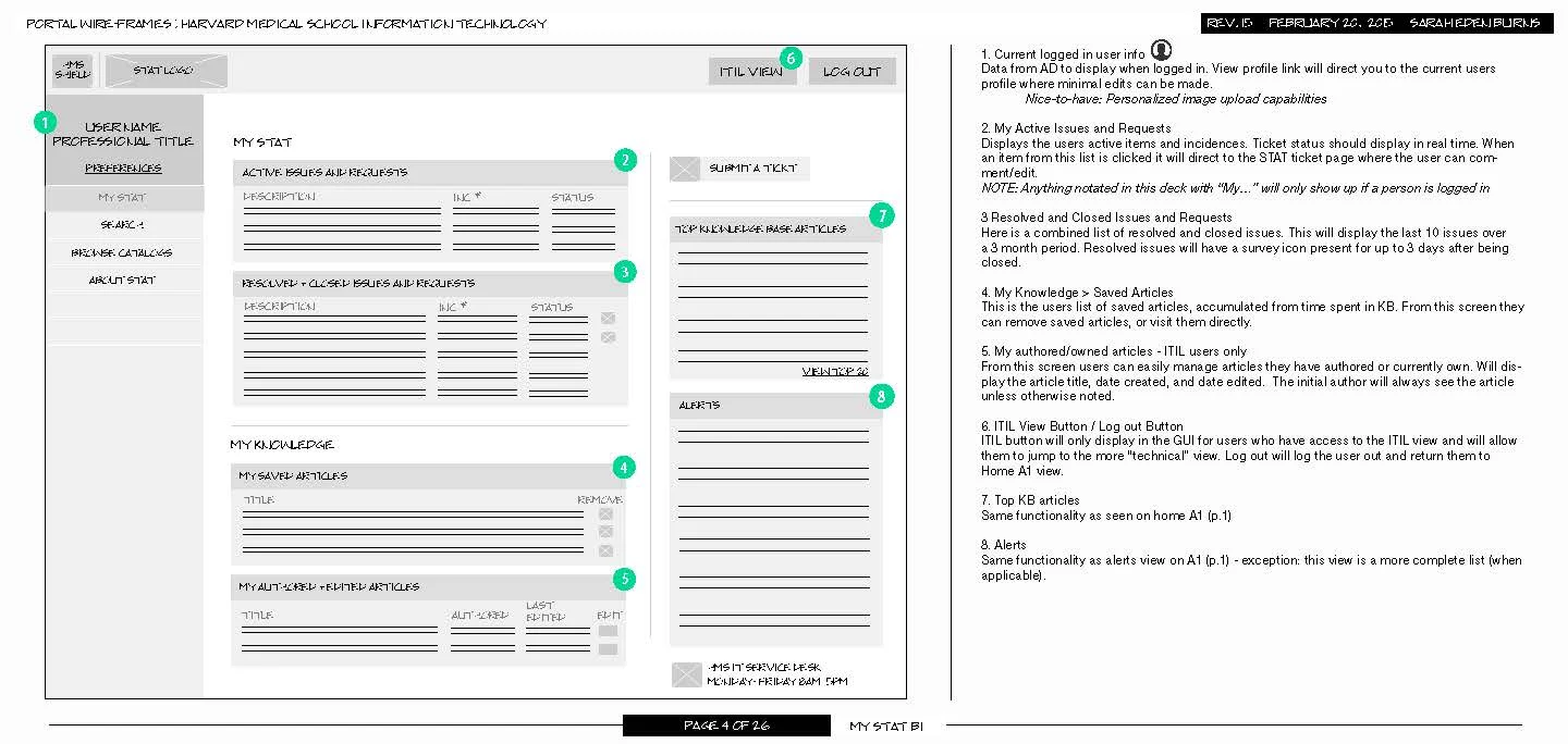 STAT was built using a popular enterprise software tool, ServiceNow with the goal to be a "one stop shop" for the HMS community. Below you'll see a selection of wire frames and comps outlining the proposed features of STAT. They include an efficient ticketing model for IT issues and requests, change management processes, a service catalog, as well as a highly anticipated searchable knowledge base.
